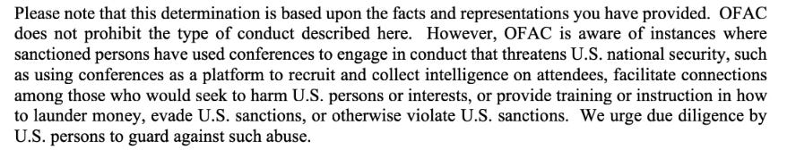 The GPE settlement does draw a line saying speech-related activities are permissible, but it’s unclear at what point that crosses into services that are sanctionable. Even in the GPE settlement letter, OFAC wrote:
