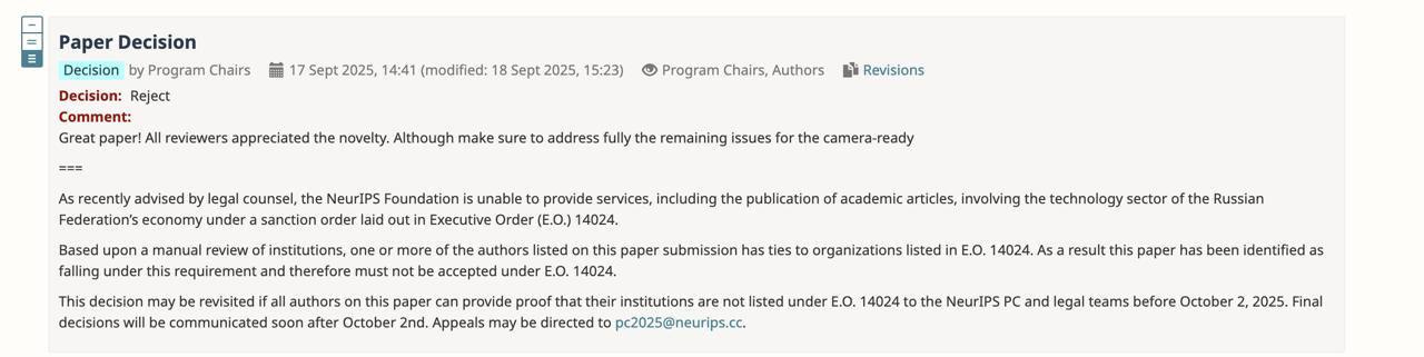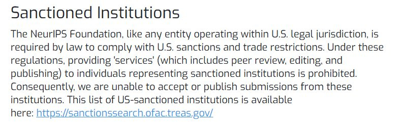 NeurIPS has announced that it will not accept or publish submissions from OFAC-sanctioned institutions. The handbook now states that “providing ‘services’ (which includes peer review, editing, and publishing) to individuals representing sanctioned institutions is prohibited.”